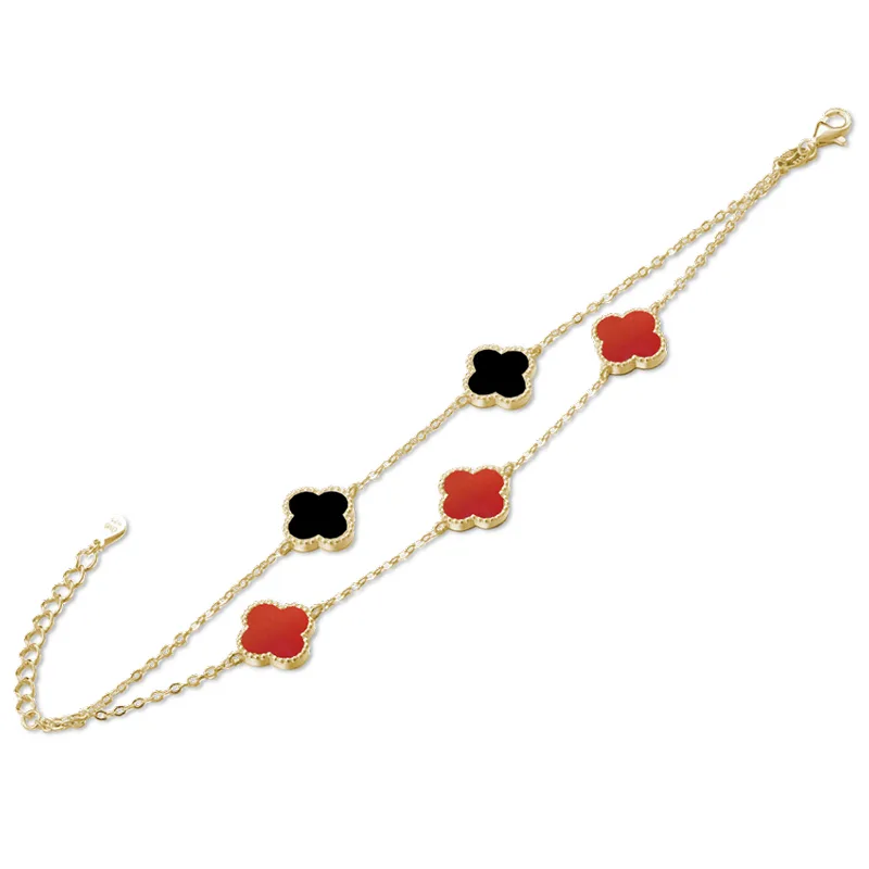 Bransoletkę zdobią zawieszki w kształcie koniczyny, ozdobione kontrastującymi kamieniami – intensywnie czerwonym agatem i klasycznym czarnym onyksem. Elementy te rozmieszczono symetrycznie na delikatnym łańcuszku, co nadaje biżuterii harmonijny wygląd. Czerwony agat symbolizuje pewność siebie, a onyks – siłę i ochronę.