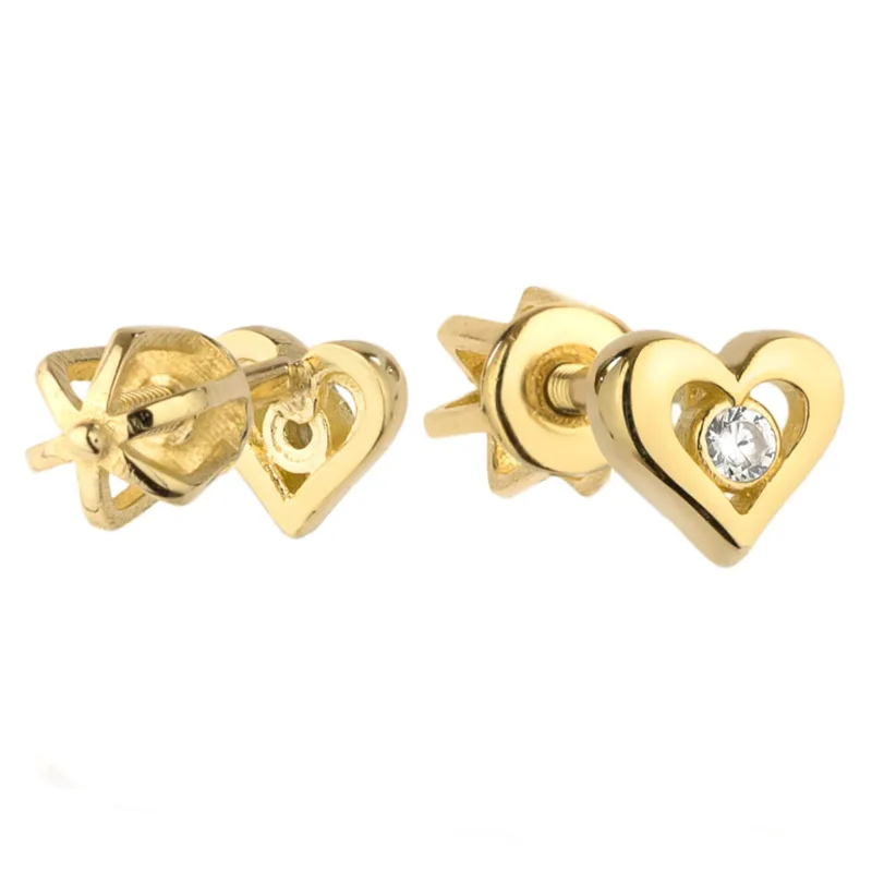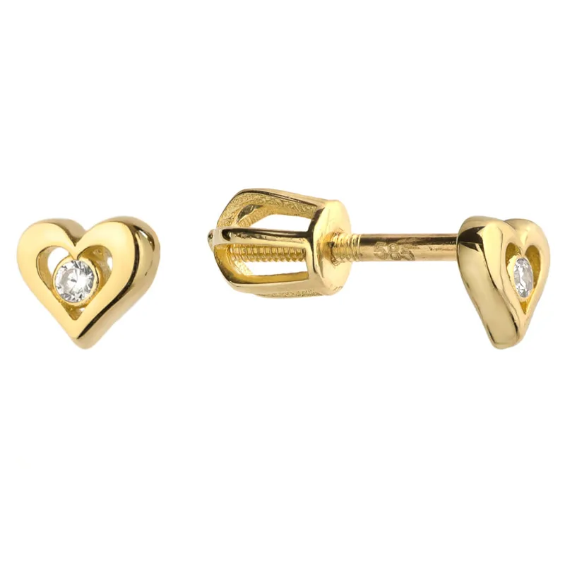 Kolczyki złote serduszka z cyrkonią na sztyfcie zakręcane to subtelna i urocza biżuteria. Klasyczny kształt serca połączono z delikatnym blaskiem cyrkonii. Wykonane z 14-karatowego złota (próba 585), prezentują się elegancko i ponadczasowo.