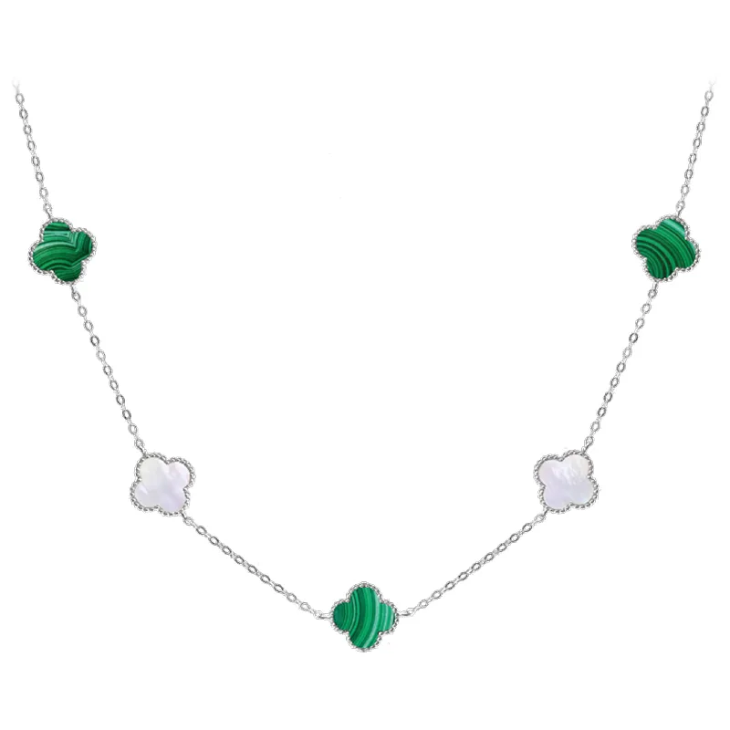 Naszyjnik zdobią zawieszki w kształcie koniczyny, ozdobione kontrastującą białą masą perłową oraz zielonym malachitem. Elementy te rozmieszczono symetrycznie na delikatnym łańcuszku, co nadaje biżuterii harmonijny wygląd. Malachit, znany z właściwości ochronnych, jest talizmanem tłumiącym negatywną energię, a masa perłowa dodaje elegancji i subtelności.