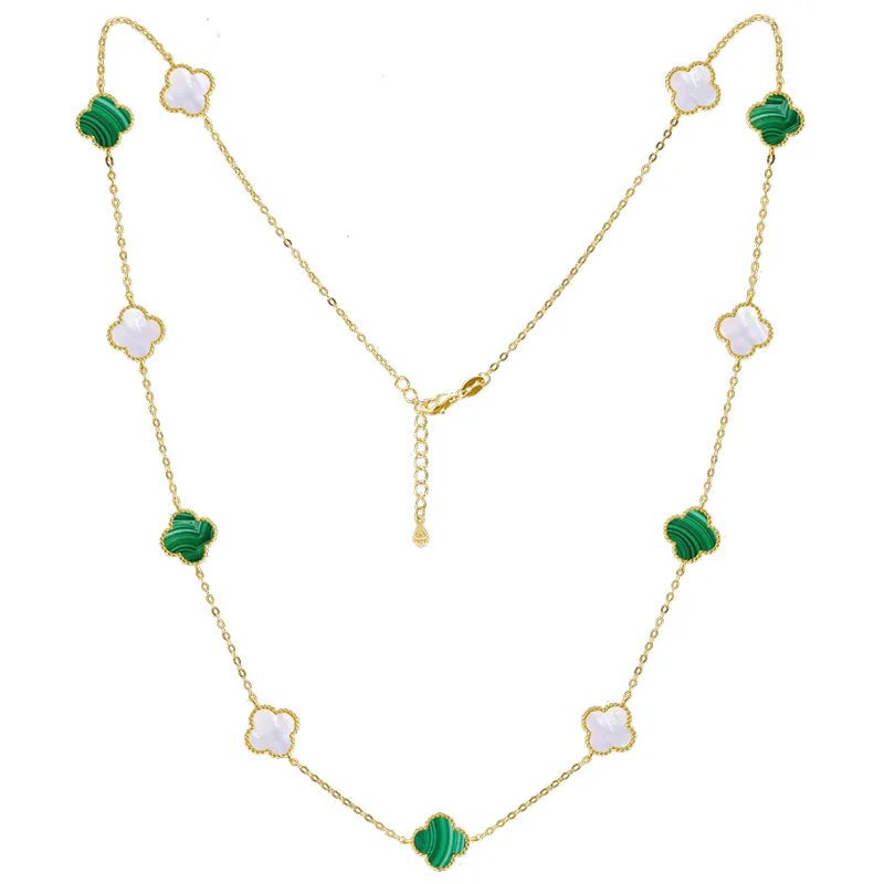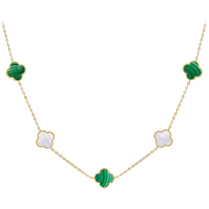 Naszyjnik zdobią zawieszki w kształcie koniczyny, ozdobione białą masą perłową oraz zielonym malachitem. Elementy te rozmieszczono symetrycznie na delikatnym łańcuszku, co nadaje biżuterii harmonijny wygląd. Malachit jest ceniony za swoje właściwości ochronne i tłumienie negatywnej energii, a masa perłowa dodaje subtelnego blasku i elegancji.