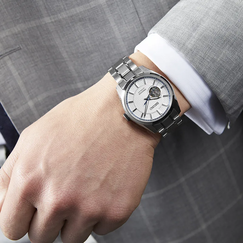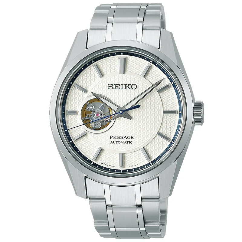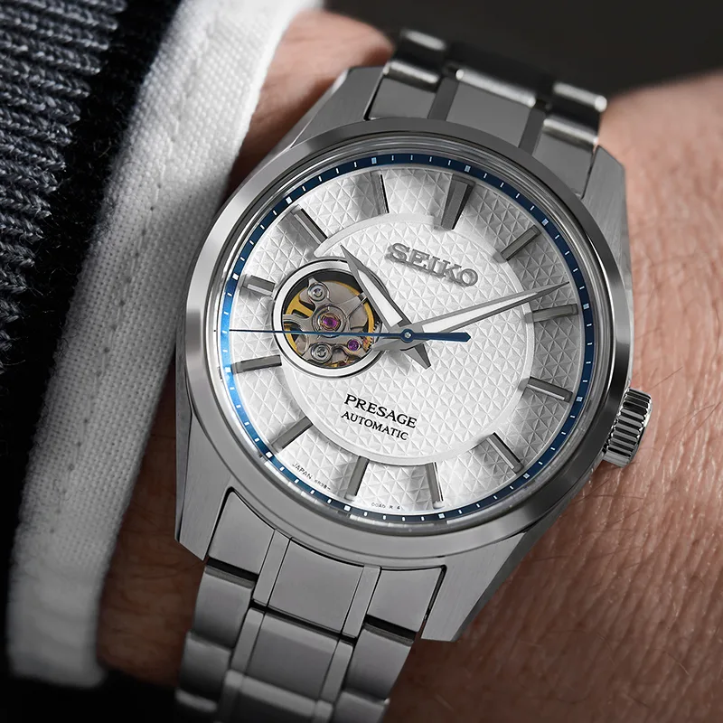 Kolekcja Seiko Presage Sharp Edged łączy nowoczesną japońską estetykę z doskonałym wykonaniem. Projektanci zaczerpnęli inspirację z tradycyjnego wzoru Asanoha, który symbolizuje siłę i rozwój. Wzór zdobi jasną tarczę z geometryczną fakturą i otwartym sercem, pozwalającą obserwować pracę mechanizmu.