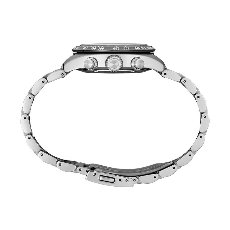 Stalowa koperta i bransoleta zapewniają trwałość i wygodę. Bezel z podziałką tachymetru pozwala szacować prędkość na podstawie czasu.