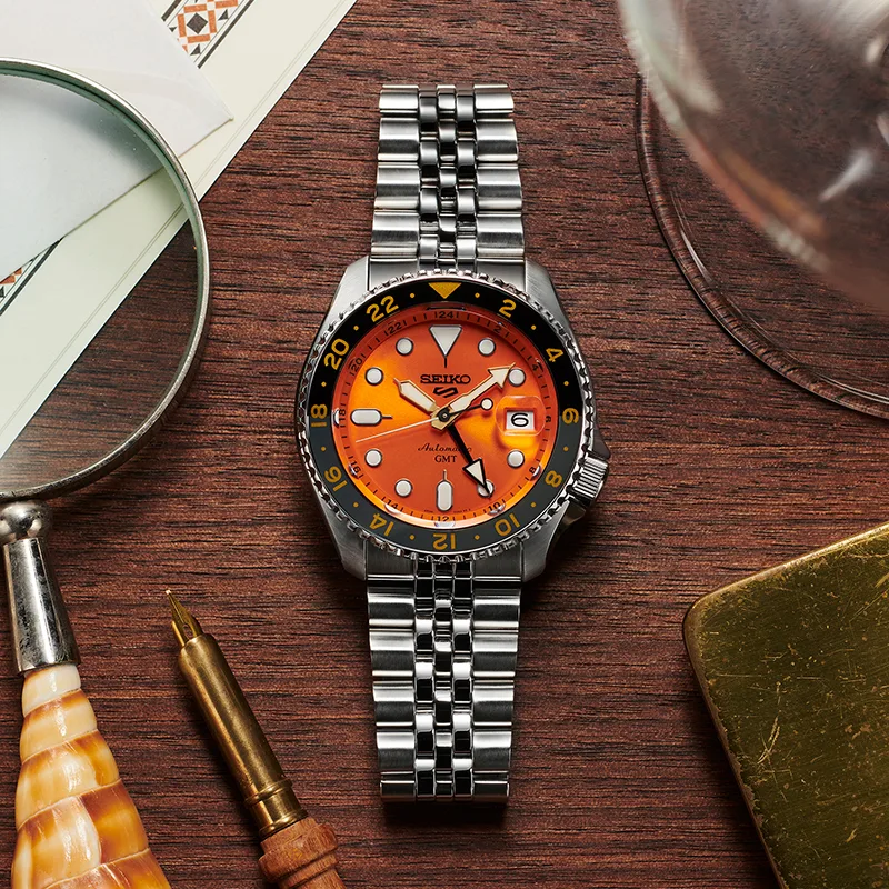 Zegarek przyciąga wzrok intensywnie pomarańczową tarczą oraz dwukolorowym bezelem 24-godzinnym, który ułatwia odczyt czasu w drugiej strefie. Zastosowana wskazówka GMT w żółtym kolorze pozwala śledzić czas międzynarodowy, a wypukłe szkło Hardlex z lupką nad datownikiem zwiększa czytelność.