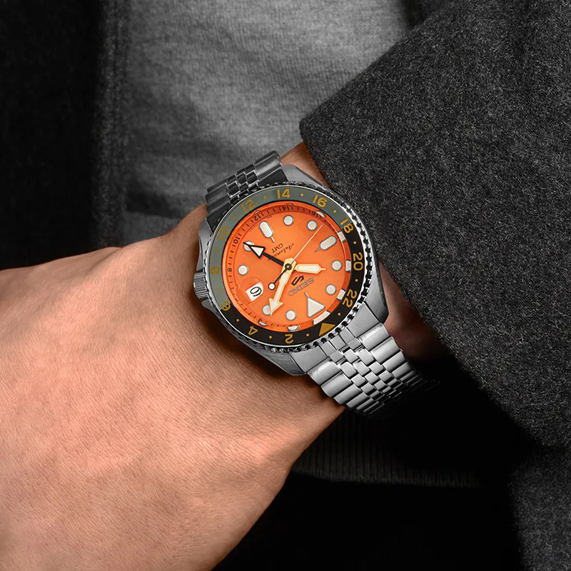 Zegarek męski Seiko SSK005K1 5 Sports GMT „Mikan Orange” napędza automatyczny mechanizm Seiko 4R34 z możliwością ręcznego dokręcania. Rezerwa chodu wynosi około 41 godzin.