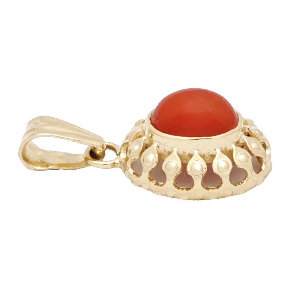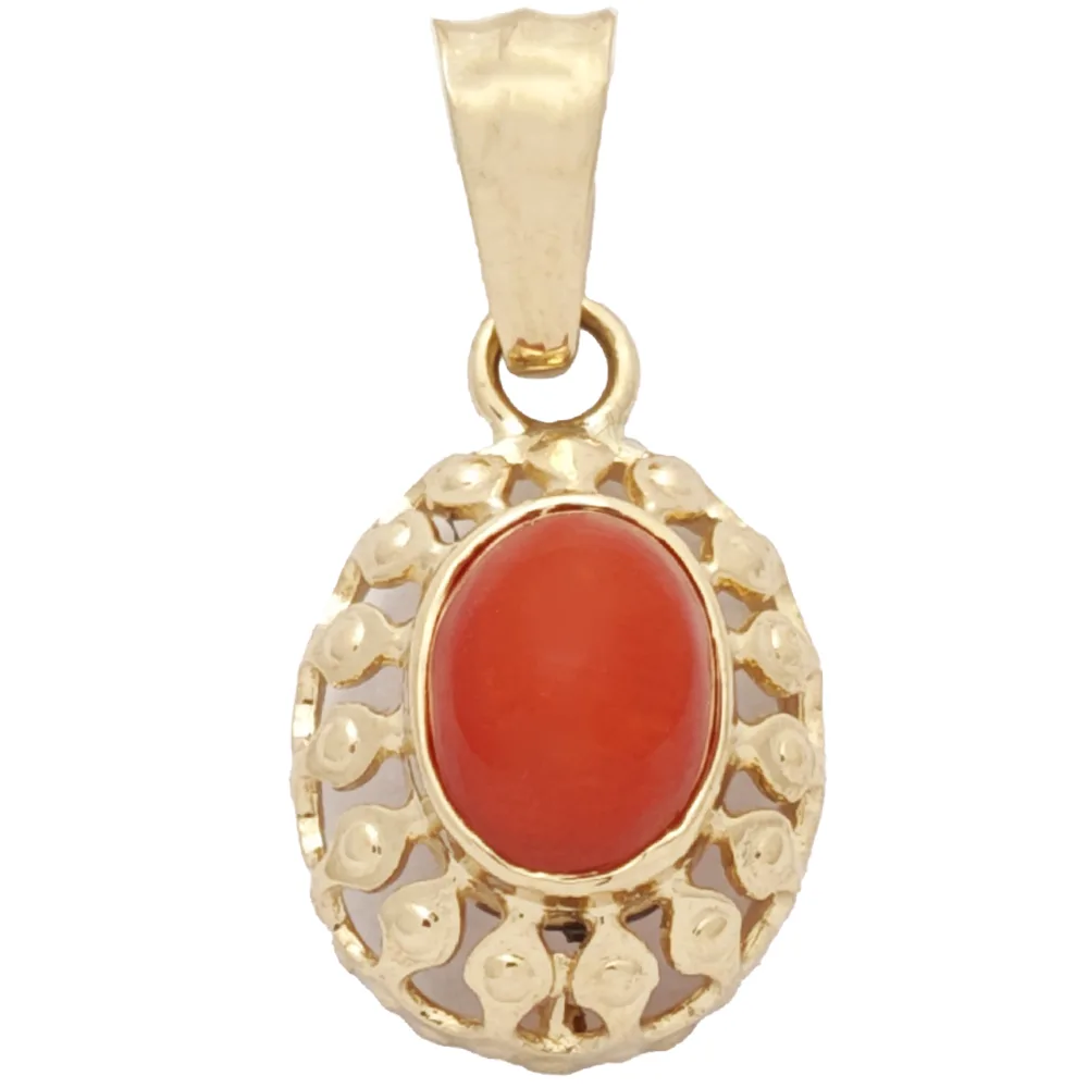 Zawieszka złota wykonana ręcznie z najwyższej jakości żółtego złota próby 585 oraz najwyższej jakości i gatunku korala naturalnego.