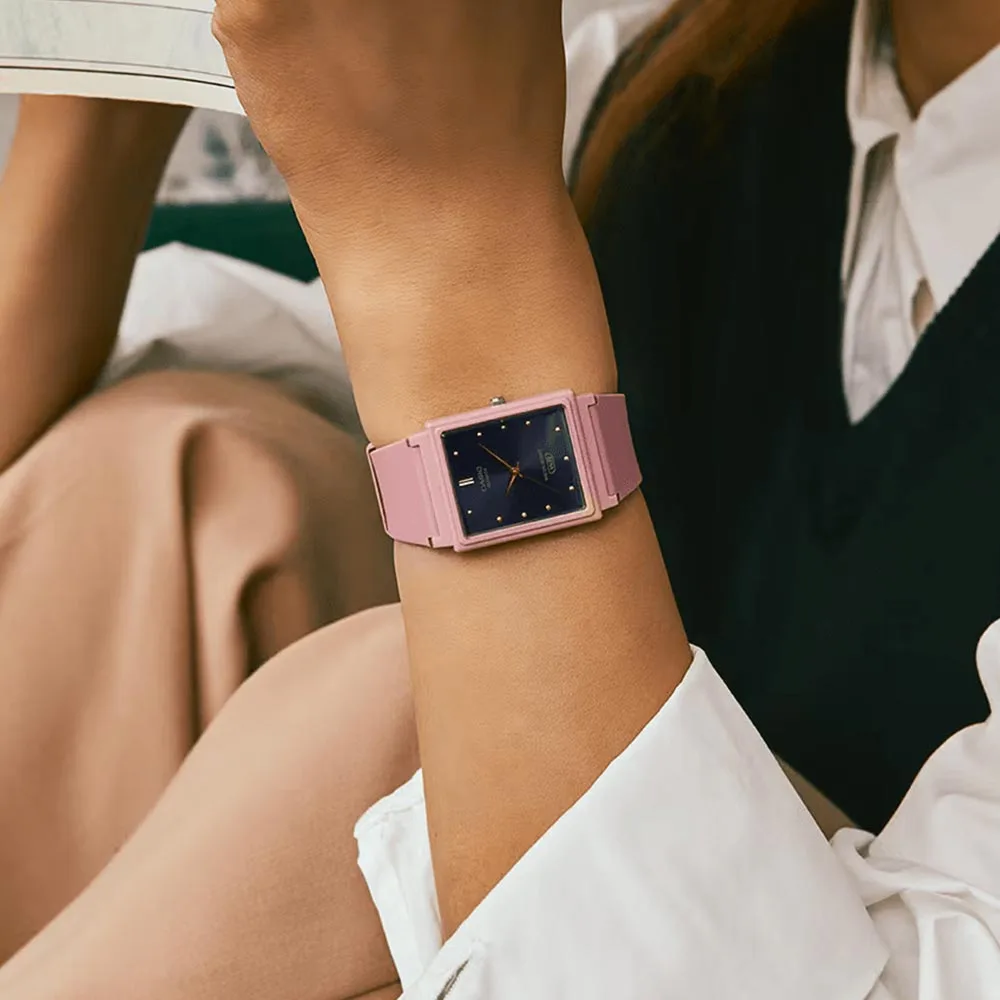 Zegarek damski Casio MQ-38UC-4AER POP to lekki i stylowy model o nowoczesnym wyglądzie. Prostokątna koperta oraz matowe wykończenie w różowym kolorze nadają zegarkowi minimalistyczny i modny charakter.