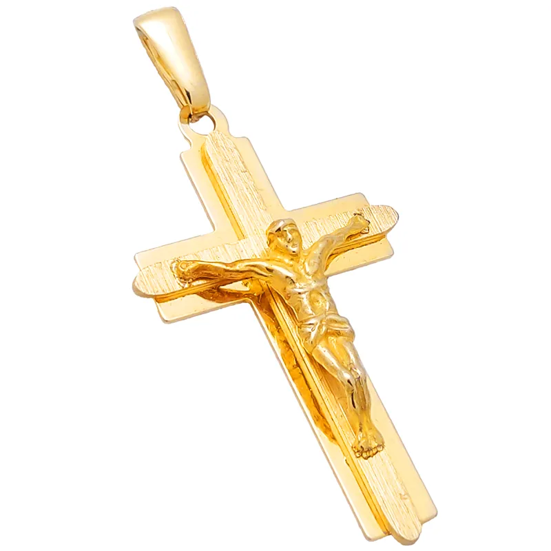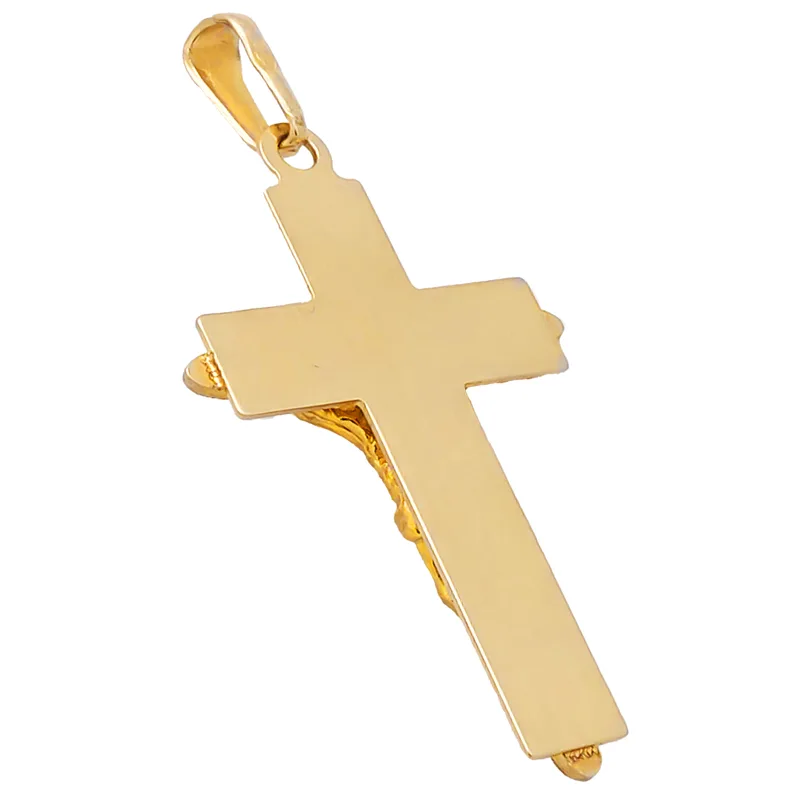 Na froncie krzyżyka znajduje się wizerunek ukrzyżowanego Jezusa, starannie wyrzeźbiony, co nadaje biżuterii wyrazistości i głębi. Kontrast między gładkimi i fakturowanymi powierzchniami podkreśla unikalny charakter zawieszki. To elegancki i symboliczny dodatek, który doskonale komponuje się z łańcuszkiem.