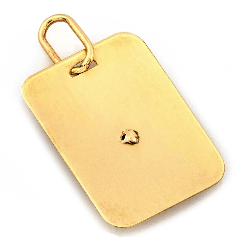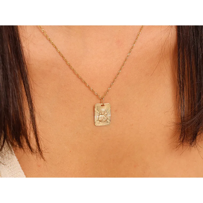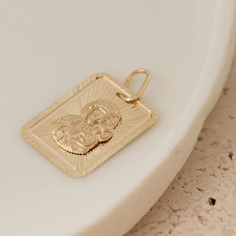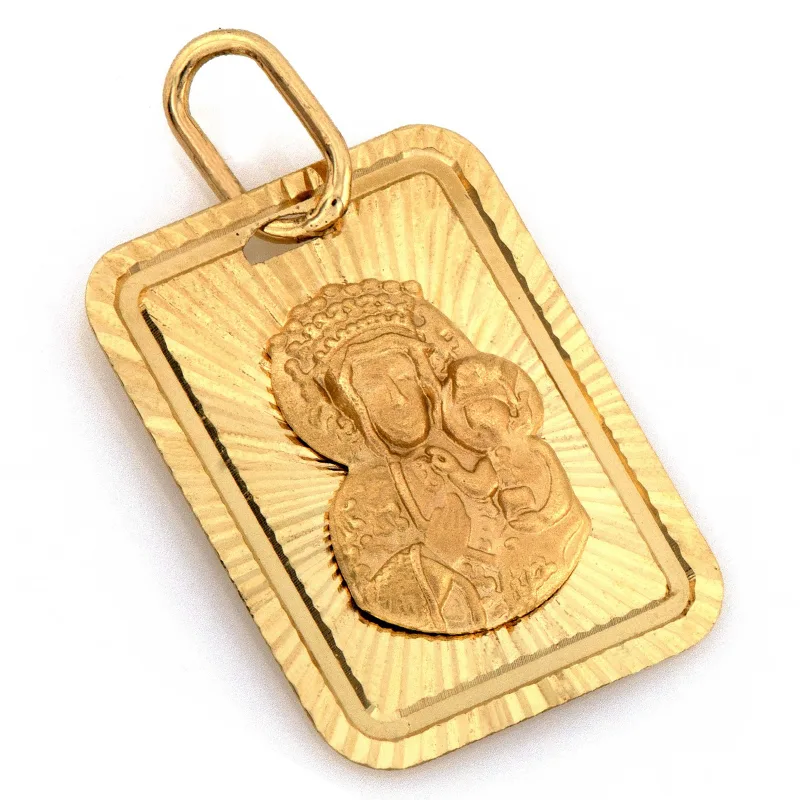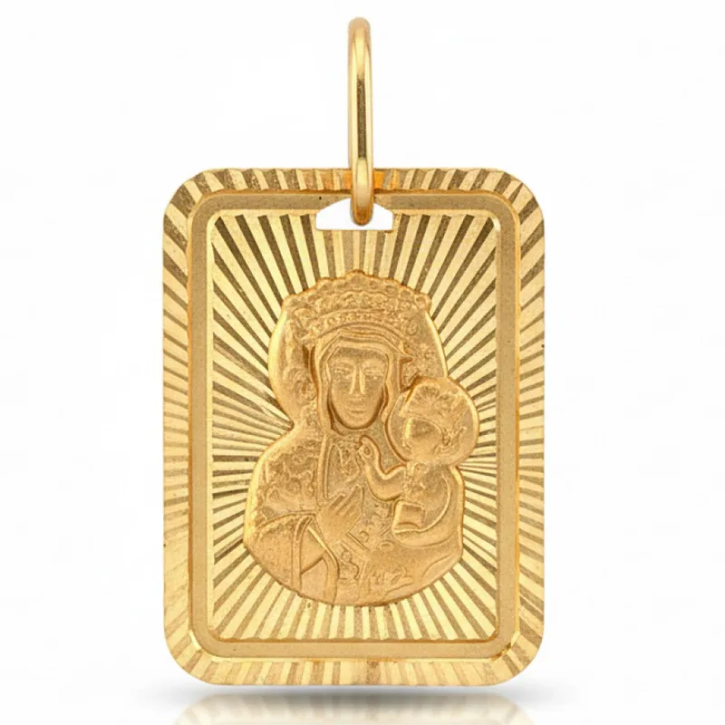 Złoty medalik Matka Boża Częstochowska 585 to wyjątkowa zawieszka wykonana z 14-karatowego złota (próba 585). Klasyczny prostokątny kształt oraz precyzyjnie wykonany wizerunek Matki Bożej Częstochowskiej podkreślają religijny charakter medalika. Tył zawieszki jest gładki, dzięki czemu możliwe jest wykonanie spersonalizowanego graweru.