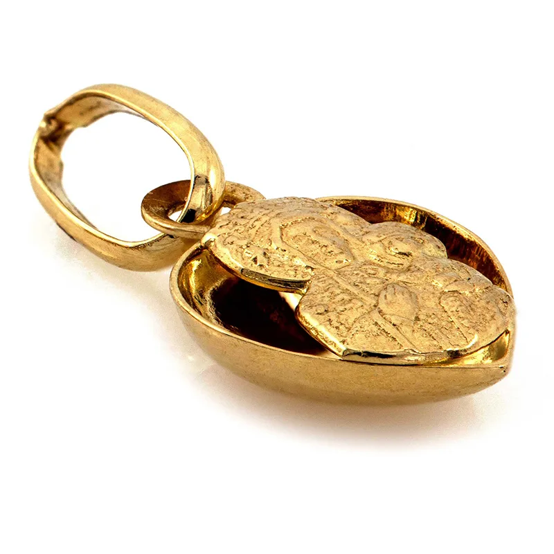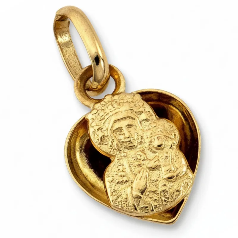 Złoty medalik Matka Boża Częstochowska Serce 585 to subtelna zawieszka w kształcie serca, wykonana z 14-karatowego złota (próba 585). W centralnej części medalika znajduje się delikatny wizerunek Matki Bożej Częstochowskiej, który podkreśla jego religijny charakter. Gładki, wypukły tył w kształcie serca nadaje całości eleganckiego wyglądu.