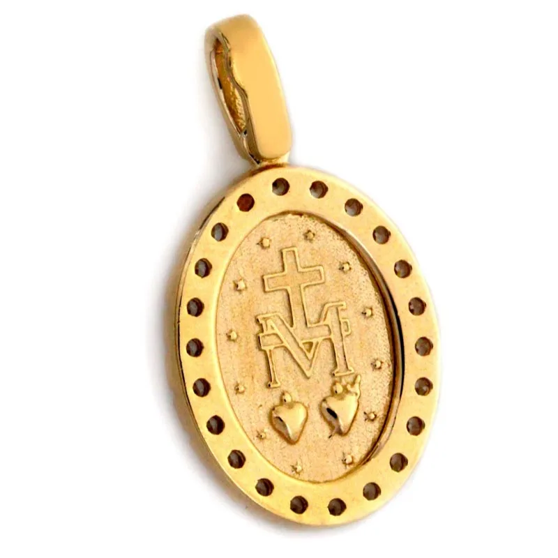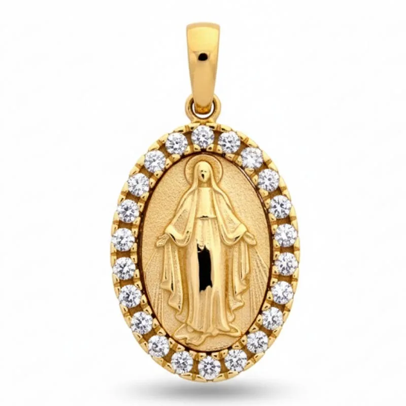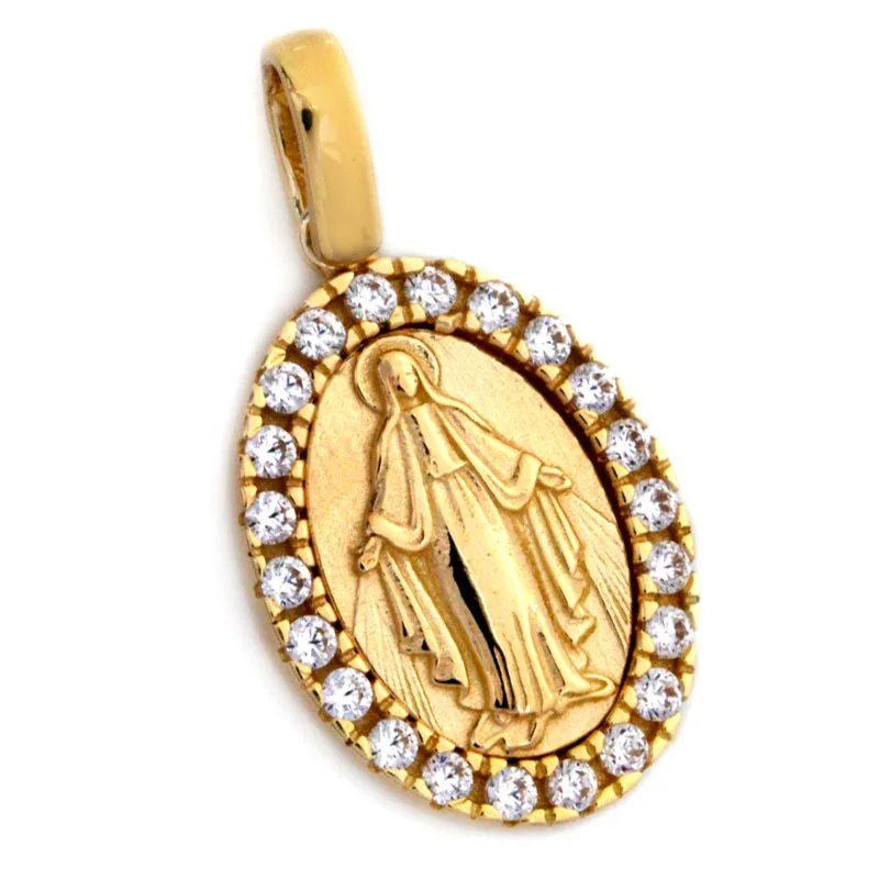 Złoty medalik Matka Boża Niepokalana z cyrkoniami 585 to wyjątkowa biżuteria o głębokim znaczeniu religijnym. Wykonany z 14-karatowego złota (próba 585), przedstawia wizerunek Matki Bożej Niepokalanej, symbolizującej opiekę i wiarę. Owalna forma oraz lśniące cyrkonie wokół medalika nadają mu elegancki i subtelny charakter.
